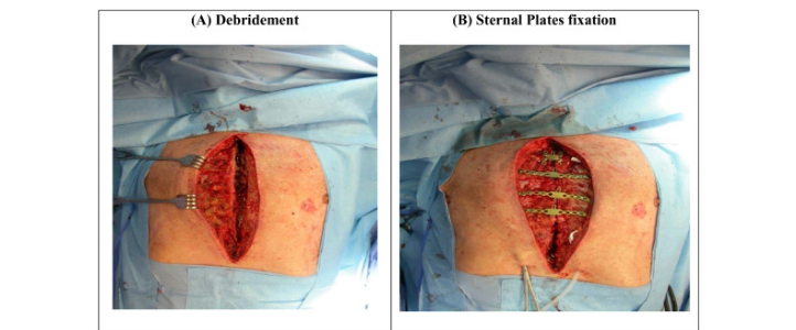 Surgical debridement includes open wounds, lavage using antibiotic saline, removal of old sternal wires, and excision of all wound edges including skin, subcutaneous tissue, and necrotic tissue in the mediastinum.